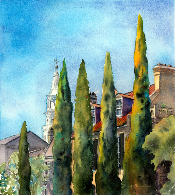 On my last painting, when I thought I was done, I signed in pencil. Then (naturally!) I wanted to add more color to the area, so I quickly signed with masking fluid (using my handy dandy thinnest twig as my signing utensil). When it was dry, I painted a couple more layers of watercolor over the area. The resulting signature was better than if I had left just the pencil. Not perfect...next time I'm going to be a bit more careful with the application of the masking fluid.